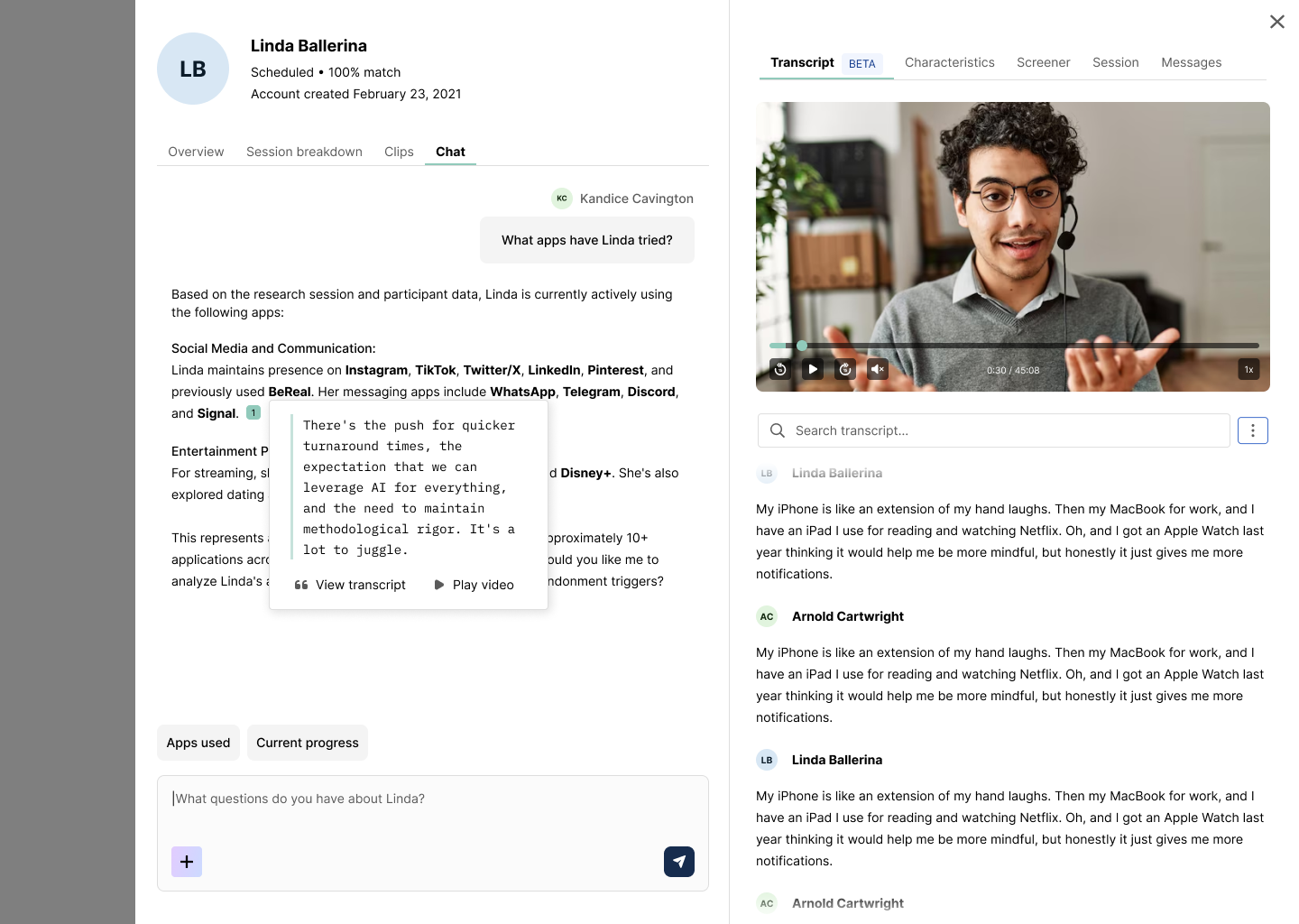 Because AI Chat Mode is designed for transparency, every response includes direct quotes, clickable citations, and linked timestamps. For every response you intend to use in your final reports, click through to review the context, tone, and nuance to confirm the quote’s accuracy before sharing.