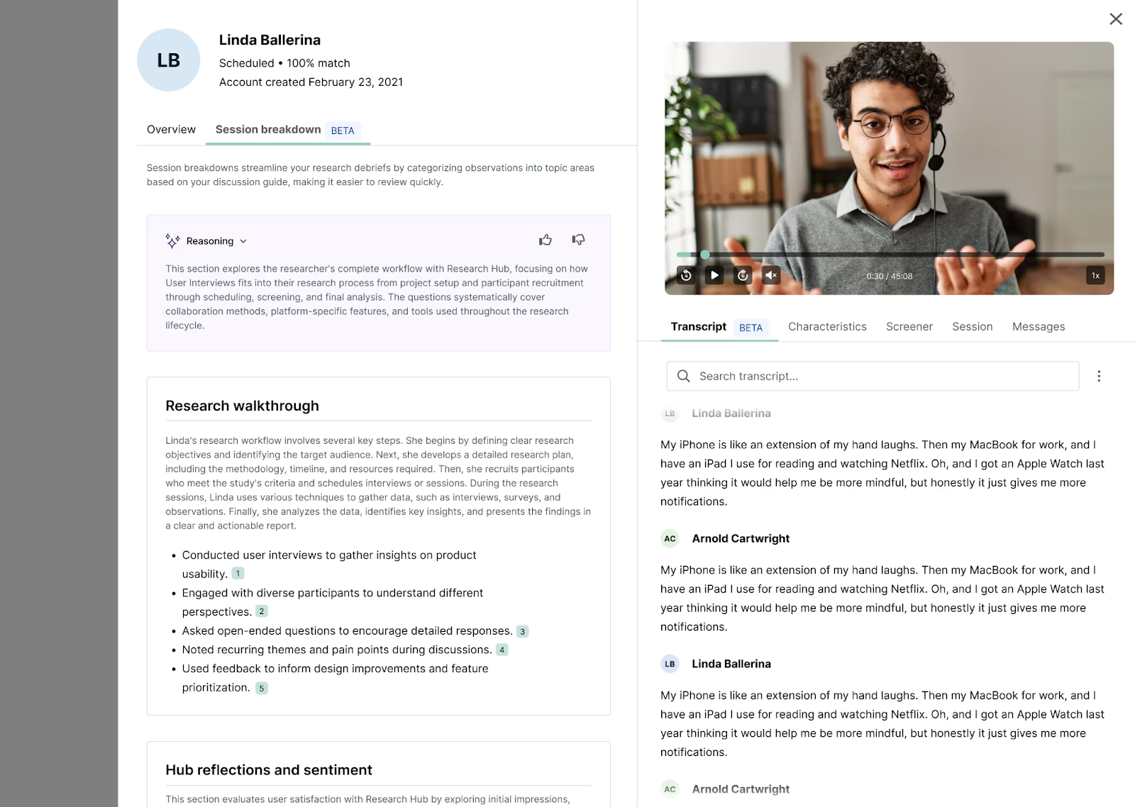Session breakdowns help you review interviews faster by organizing participant responses into topic-based observations—without replaying full sessions or manually tagging transcripts.