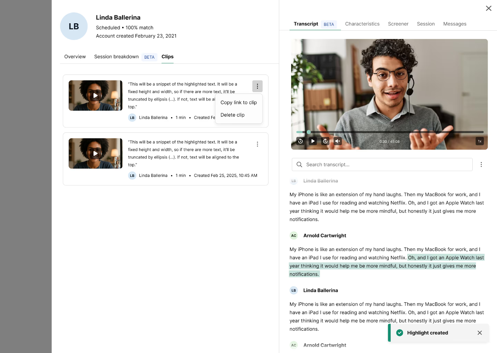 To create a clip, highlight text on the transcript or data grid, click “Clip”, and this will instantly create a saved clip that you can easily reference or share with your team. You can view all your saved clips in the Clips tab. This brings together clips from every participant in one place for easy review.