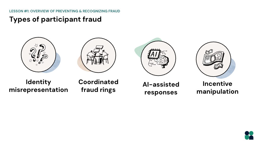 Fraud in research used to look like simple misrepresentation—someone fudging their age or exaggerating their experience. Today, it’s a global issue. Bad actors use sophisticated tools, automation, and AI to infiltrate studies at scale. As research grows in value, fraudsters see opportunities, which makes ongoing prevention more important than ever.