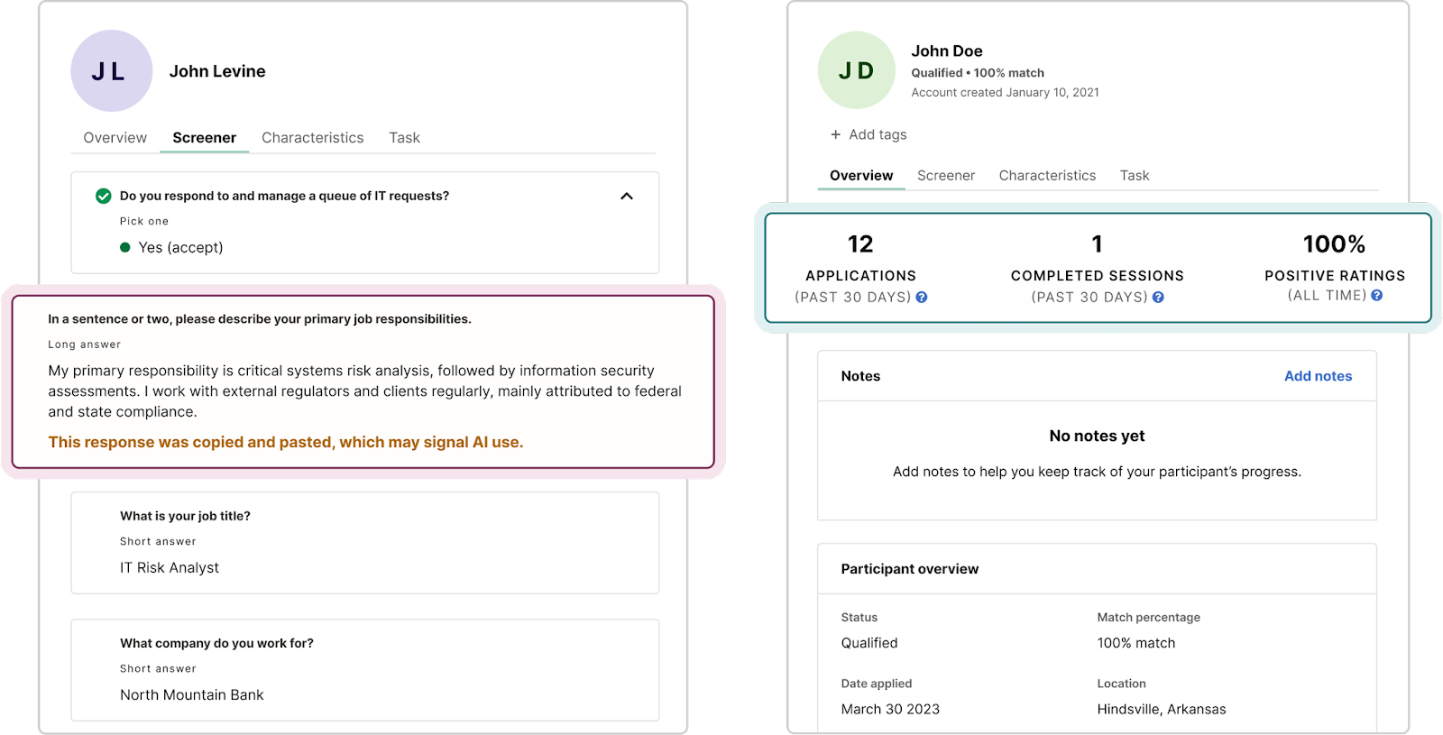 Use open-ended questions that require personal detail, contextual understanding, or creativity—things AI often struggles to fake convincingly. And rely on UI’s platform features like AI-use flags to spot suspicious screener responses automatically.